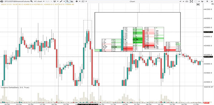 این بار به قراردادهای آتی بیت‌کوین نگاه می‌کنیم، با داده‌های گرفته‌شده از صرافی Binance. برای تنظیم فووت‌پرینت ۶۰ دقیقه‌ای در این بازار پویا، به منوی بالای پنجره نمودار بروید و پارامتر Scale را روی ۲۰۰ تنظیم کنید. همچنین در تنظیمات نمودار، در تب Cluster Settings، تقسیم‌بندی مقادیر خوشه (Cluster Values) را روی ۱۰۰ قرار دهید.