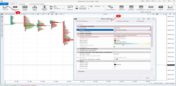 برای پیکربندی نمودار، پنجره مدیریت تنظیمات (Settings Manager) را باز کنید. برای این کار می‌توانید از ترکیب کلید Ctrl+S، یا کلیک روی آیکون تنظیمات در بالای پنجره نمودار، یا استفاده از منوی زمینه (Context Menu) استفاده کنید. سپس به تب Clusters بروید (شماره ۲ در تصویر بالا). در این بخش، مجموعه‌ای از پارامترها برای سفارشی‌سازی ظاهر نمودار مانند رنگ‌ها، تنظیمات سطح حداکثر و سایر گزینه‌ها موجود است.