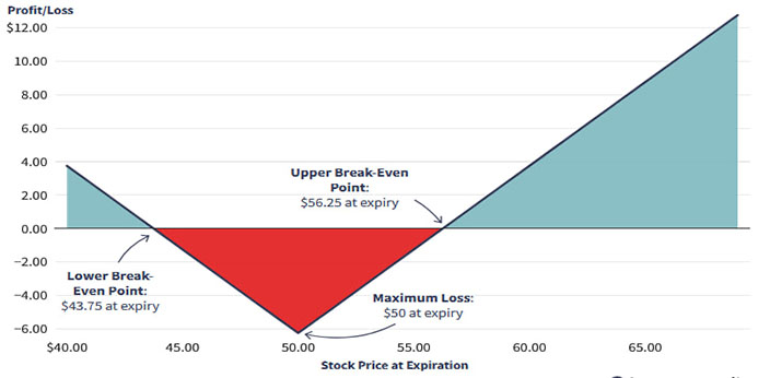 این استراتژی به‌گونه‌ای طراحی شده است که اگر قیمت سهام بالاتر از 52 دلار یا پایین‌تر از 48 دلار برود، سودآور شود. اما اگر قیمت سهام در محدوده 48 تا 52 دلار باقی بماند، حداکثر زیان شما همان 585 دلار خواهد بود.