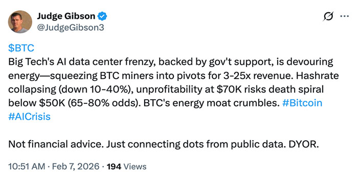 بهگزارش تحلیلی که روز شنبه توسط قاضی گیبسون (Judge Gibson) در شبکه اجتماعی X منتشر شد، رشد سریع تقاضا برای مراکز داده هوش مصنوعی (AI Data Centers) باعث شده برخی استخراجکنندگان بیتکوین بهتدریج منابع خود را از استخراج رمزارز به سمت زیرساختهای مرتبط با هوش مصنوعی منتقل کنند. این تغییر مسیر، به کاهش ۱۰ تا ۴۰ درصدی نرخ هش (Hash Rate) شبکه منجر شده است؛ عاملی که میتواند بهطور غیرمستقیم بر احساسات بازار، اعتماد سرمایهگذاران و فشار فروش در بازار بیتکوین تأثیرگذار باشد.