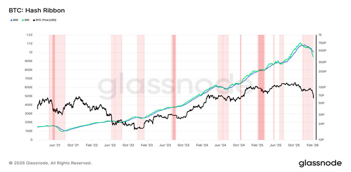 در همین حال، شاخص Hash Ribbons نیز هشدار مهمی صادر کرد: میانگین نرخ هش ۳۰ روزه به زیر میانگین ۶۰ روزه سقوط کرده است؛ وضعیتی که بهعنوان یک وارونگی منفی (Negative Inversion) شناخته میشود و بهطور تاریخی نشاندهنده فشار شدید بر درآمد ماینرها و افزایش ریسک تسلیم شدن (Capitulation) آنها است.