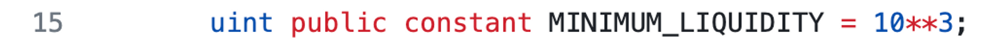 به عنوان مثال، فرض کنید در استخر ۱۰ توکن token0 و ۱۰ توکن token1 وجود داشته باشد. اگر کاربر ۱۰ توکن token0 و صفر توکن token1 وارد کند، در این صورت مقدار مینیمم از نسبت ها (۱۰/۱۰ ، ۰/۱۰) محاسبه می شود و کاربر هیچ توکن نقدینگی (LP Token) دریافت نخواهد کرد!