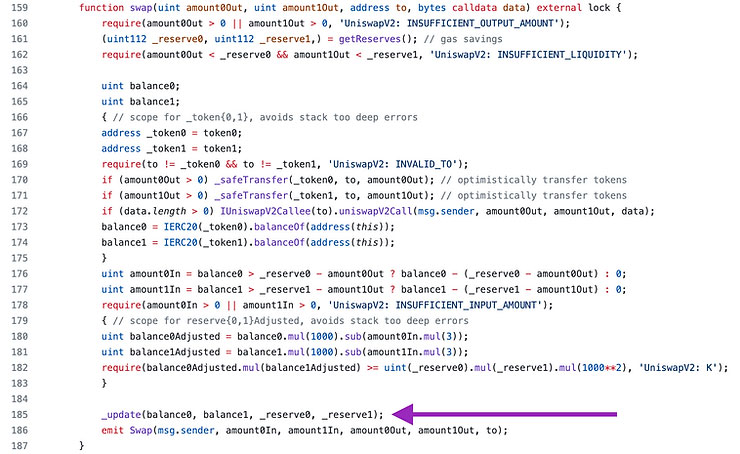 در این تابع منطق زیادی برای به روز رسانی اوراکل TWAP (میانگین قیمت وزنی زمان دار) وجود دارد. اما فعلا فقط خطوط ۸۲ و ۸۳ برای ما اهمیت دارند. در این خطوط، متغیرهای ذخیره شده reserve0 و reserve1 به روز رسانی می شوند تا موجودی های جدید را بازتاب دهند.